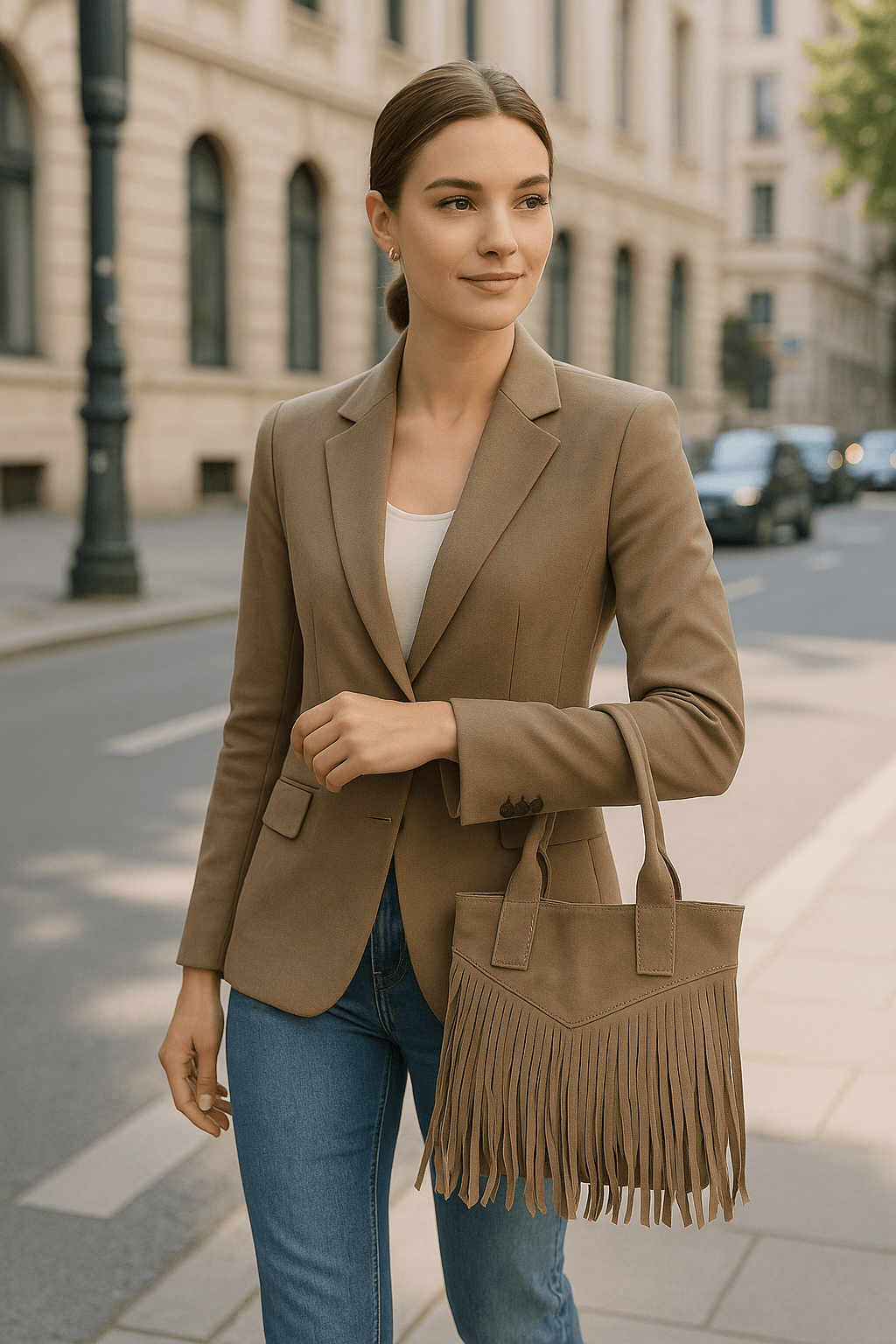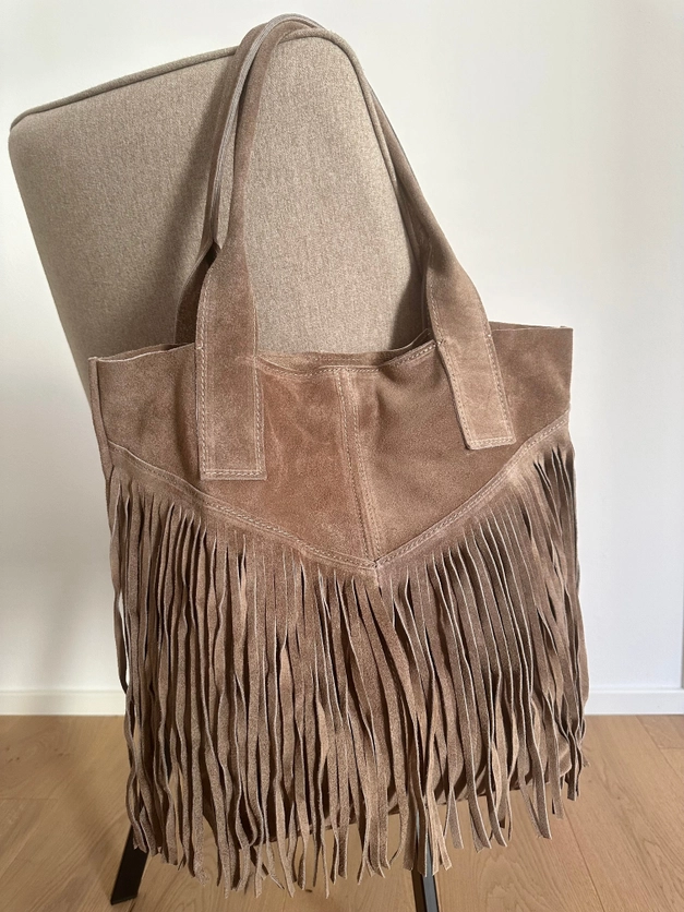 Αναδείξτε το στυλ σας με αυτήν τη μοναδική τσάντα χειρός σε δερματίνη suede. Ο μοντέρνος σχεδιασμός της με κρόσσια στο μπροστινό μέρος χαρίζει boho-chic χαρακτήρα, ενώ το ουδέτερο χρώμα της την καθιστά ιδανική για κάθε περίσταση.