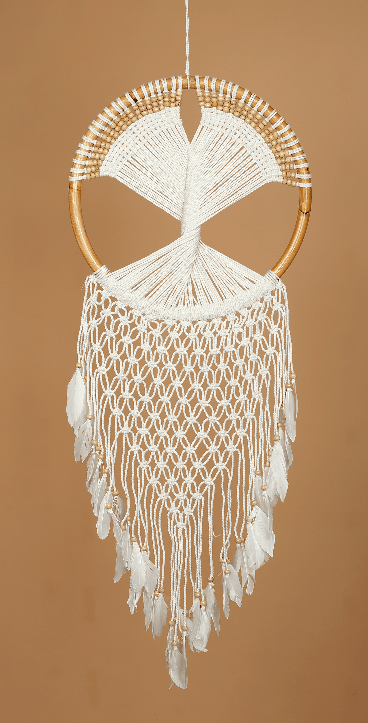 Εντυπωσιακή πλέξη με κόμπους και κρεμαστά φτερά σε λευκό χρώμα και χάντρες στο τελείωμα.