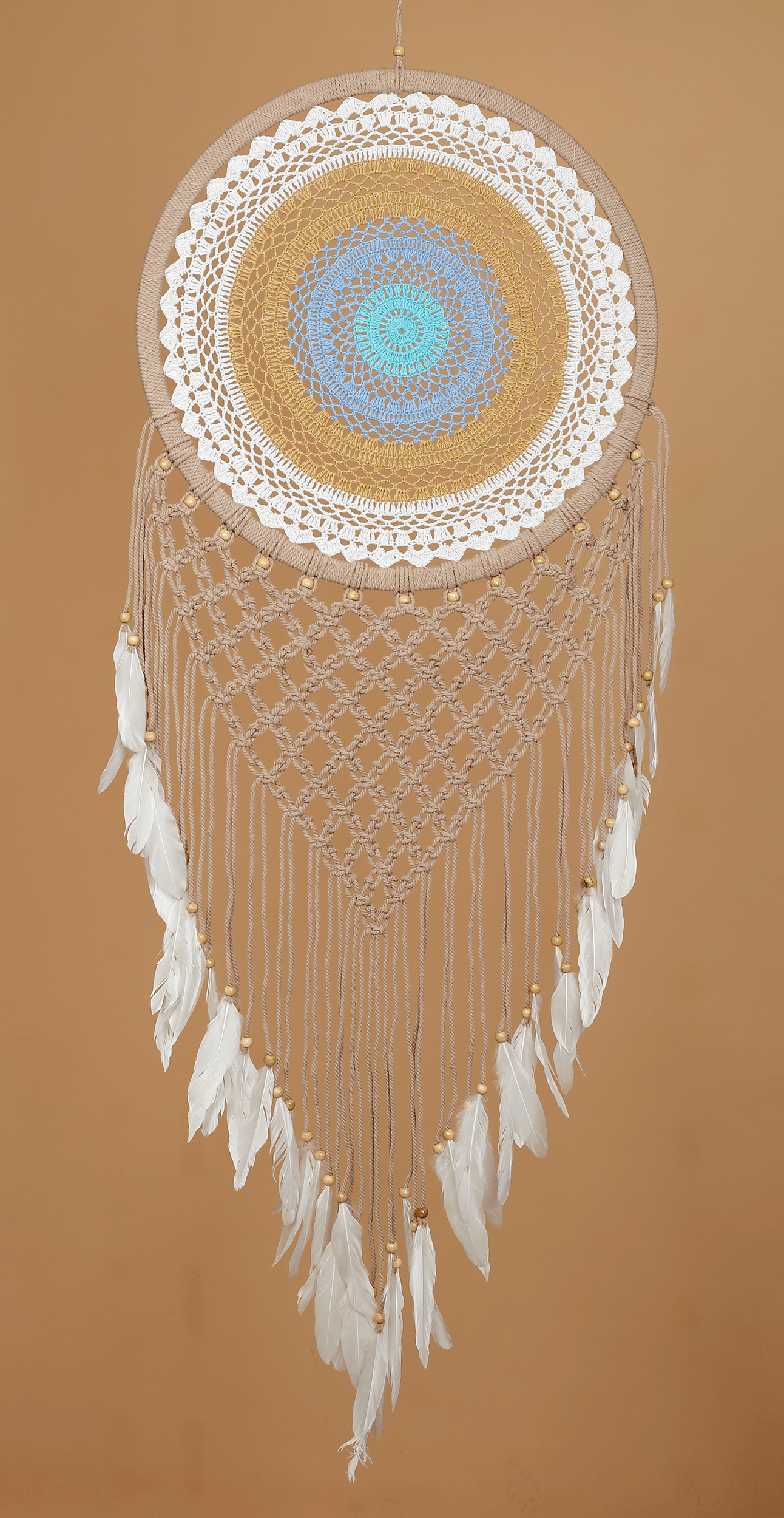 Φέρτε αρμονία, προστασία και κομψότητα στον χώρο σας με αυτή τη μοναδική χειροποίητη ονειροπαγίδα, διακοσμημένη στο κέντρο με σχέδιο που θυμίζει “μάτι” – σύμβολο προστασίας από τη βασκανία. Η εντυπωσιακή πλεκτή δαντέλα σε γαλάζιο, ώχρα και λευκό δημιουργεί το εφέ του ματιού και προσδίδει στο διακοσμητικό μια ιδιαίτερη πνευματική και αισθητική αξία.