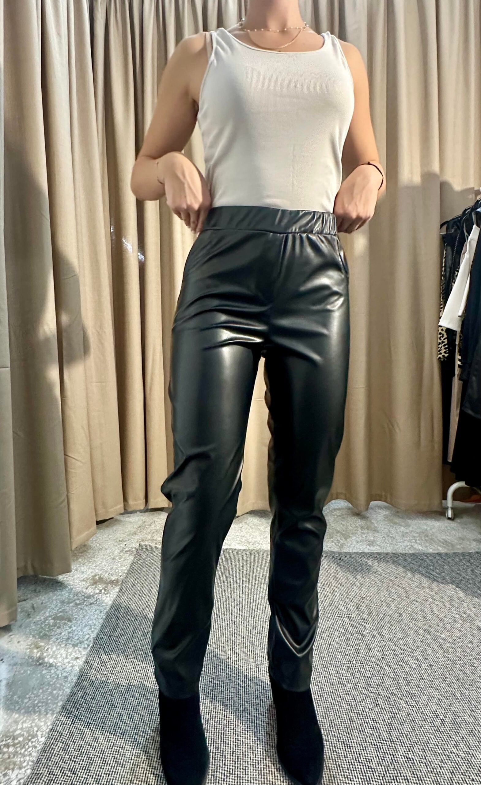 Μαύρο δερμάτινο παντελόνι σε ίσια γραμμή, με ψηλή μέση και λάστιχο για άνετη εφαρμογή. Κατασκευασμένο από ύφασμα 95% PESS και 5% SPAD, προσφέρει ελαστικότητα και ελευθερία κινήσεων, ενώ η γυαλιστερή δερμάτινη υφή του χαρίζει μοντέρνο και κομψό χαρακτήρα. Ιδανικό για καθημερινές αλλά και βραδινές εμφανίσεις, συνδυάζεται εύκολα με πουκάμισο, πλεκτό ή σακάκι για ένα στυλ που ξεχωρίζει.