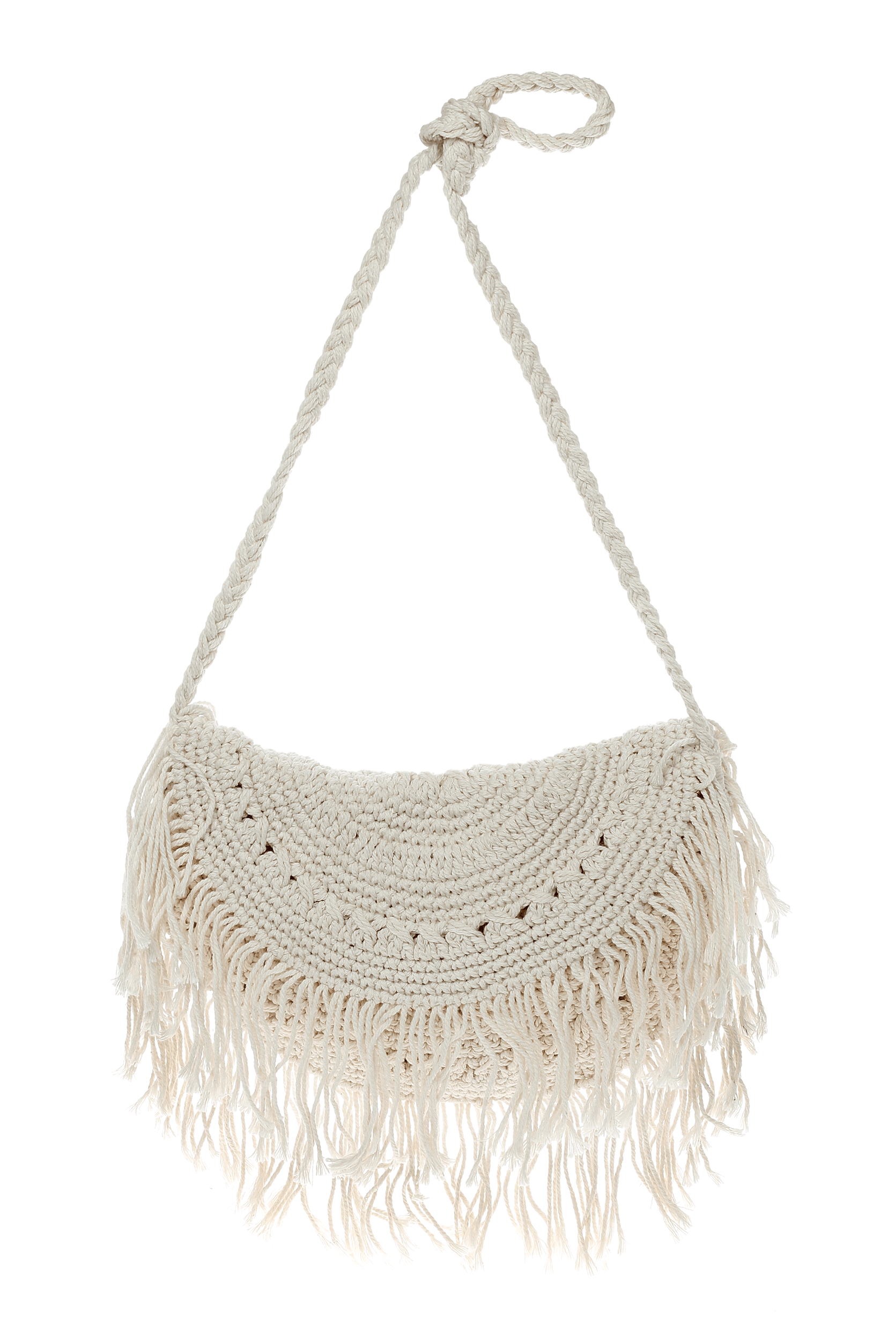 Αναδείξτε το boho chic στυλ σας με αυτή την εντυπωσιακή πλεκτή τσάντα ώμου σε φυσικό εκρού χρώμα. Κατασκευασμένη από βαμβακερό νήμα σε κυκλικό σχέδιο, διακοσμείται με μακριά κρόσσια που προσδίδουν κίνηση και μοναδικό χαρακτήρα. Διαθέτει πλεχτό ρυθμιζόμενο λουρί για άνετη εφαρμογή και κλείσιμο με φερμουάρ για ασφάλεια και πρακτικότητα.