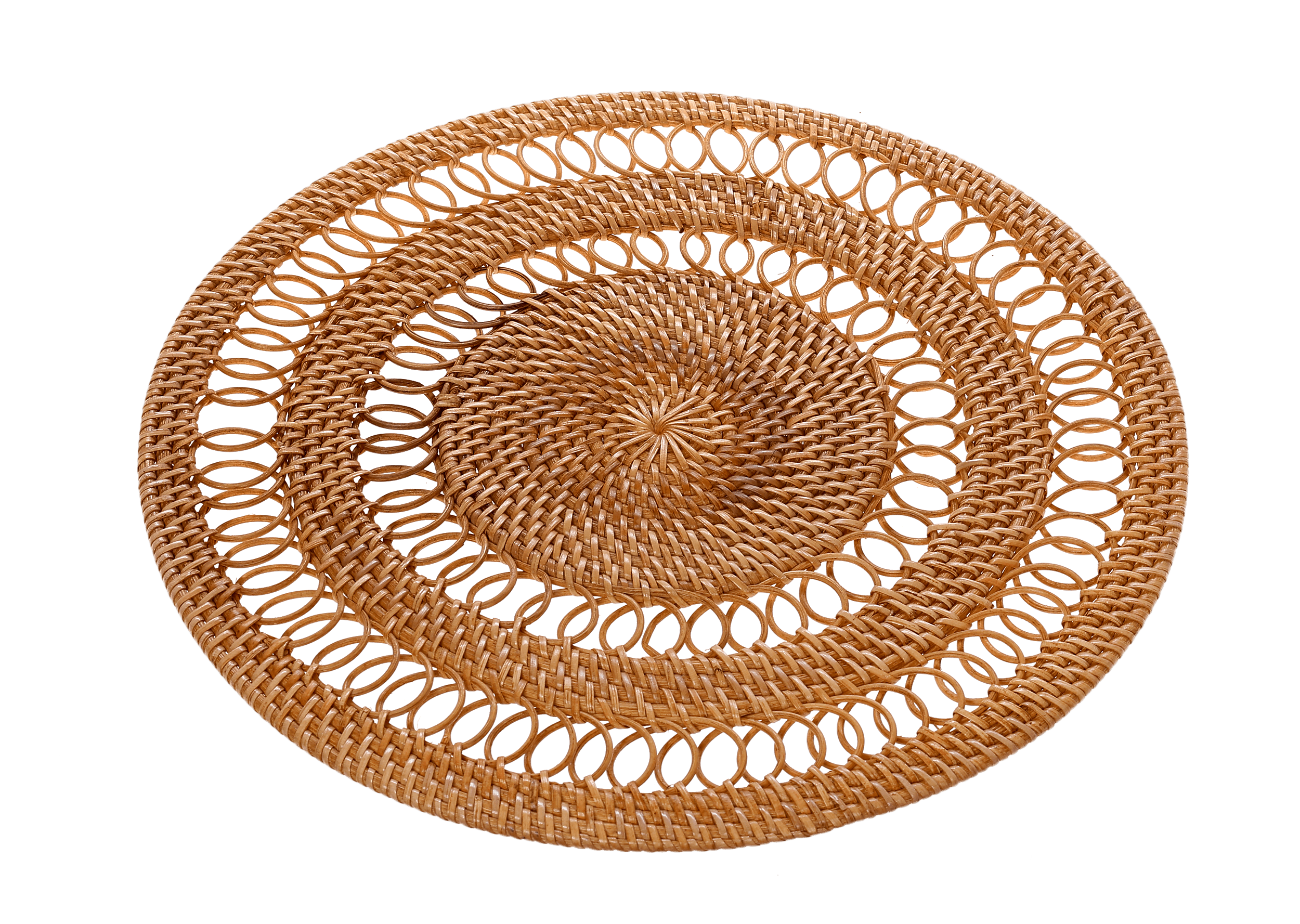 Αναβαθμίστε τη διακόσμηση του τραπεζιού σας με αυτό το εντυπωσιακό, χειροποίητο στρογγυλό σουπλά από φυσικό ρατάν. Με ξεχωριστό σχέδιο που συνδυάζει πυκνή ύφανση στο κέντρο και διακοσμητικά ανοίγματα σε σχήμα οβάλ περιμετρικά, προσθέτει φυσική κομψότητα σε κάθε τραπέζι ή τοίχο.