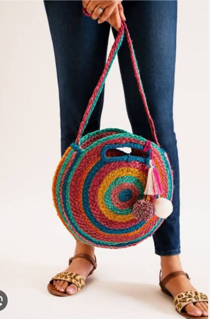 Δώσε χρώμα και ζωντάνια στο καλοκαιρινό σου στυλ με αυτή την εντυπωσιακή, στρογγυλή τσάντα από πλεγμένη jute! Με φανταχτερά κυκλικά μοτίβα σε ροζ, πράσινο, μπλε, κίτρινο και πορτοκαλί, και διακοσμητικά pom-poms και φούντες στο πλάι, αποτελεί την απόλυτη boho-chic επιλογή για τις εμφανίσεις σου.