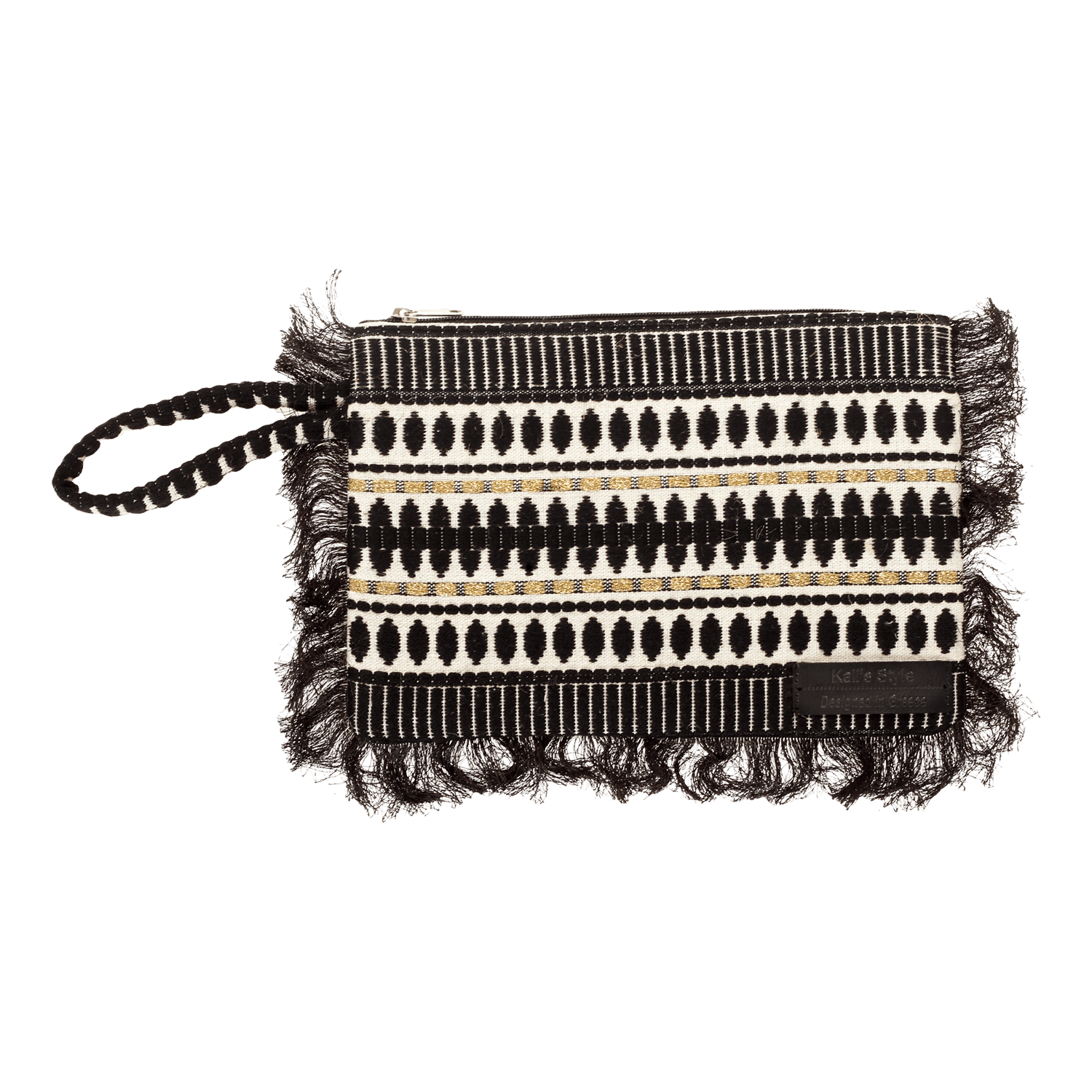 Ένα ξεχωριστό χειροποίητο τσαντάκι που συνδυάζει την κομψότητα του χρυσού με την ένταση του μαύρου. Το υφαντό γεωμετρικό σχέδιο σε εκρού φόντο αναδεικνύεται μέσα από τις λεπτές μεταλλικές αποχρώσεις και τα μαύρα μοτίβα. Διαθέτει περιμετρικά κρόσσια για μια extra boho πινελιά, ενώ το χερούλι καρπού προσφέρει άνεση και στιλ.